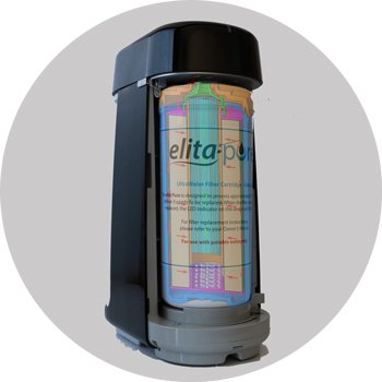 The Easy Replacement Filter System makes it easy for anyone to replace the filter in the elita Pure. We use a unique lever operated and patent pending mechanism that requires no wrenches, no straining - just a simple flip of a lever!