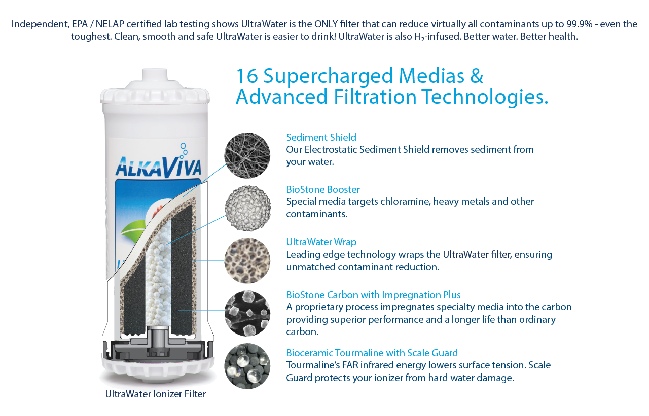 Smart Shopper's Shortcut What good is healthy water if it isn’t also clean water? To that end, be thorough in your research. Watch out for slick marketing. One company offers “customized filtration." All they really do is give you a standard (and unsightly) three filter array (installed separate from your ionizer) regardless of where you live. You end up with the extra hassle and cost of five filters and external housings to change annually. If you don’t, you void your warranty. Another company touts .01 micron as its “UltraPlus,” best solution. A .01 micron filter sounds good, and can remove microbes, but is lousy at broad contaminant removal. We have sold them for 15 years and only recommend them if you are on untreated (well) water. Read on and you’ll learn about our UltraWater technology — the most thoroughly tested and safest option available.